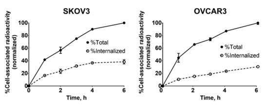 To understand the rate of cellular processing and internalization, SKOV3 and OVCAR3 cells were incubated with [99mTc]Tc-labeled Ec1-LoPE for 6 h and analyzed for total cell-associated and internalized activity using the acid wash test (Figure 3). A similar pattern was observed for the SKOV3 and OVCAR3 cell lines. The internalization was rapid with relatively small variation between cell lines. Continuous incubation resulted in a slow increase in cell-bound activity of [99mTc]Tc-labeled Ec1-LoPE over time and the internalized fraction at 6 h reached 38 ± 3% of total cell-associated activity for SKOV3 and 31 ± 0% for OVCAR3 cells.