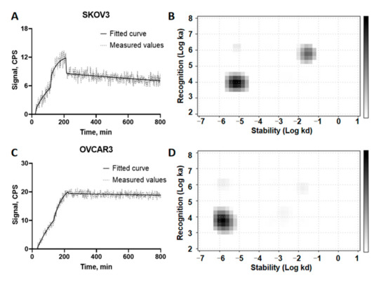Binding kinetics of [125I]I-Ec1-LoPE to (A) SKOV3 cells and (C) OVCAR3 cells analyzed by TraceDrawer and corresponding interaction maps (B,D). Data are representatives from duplicates.