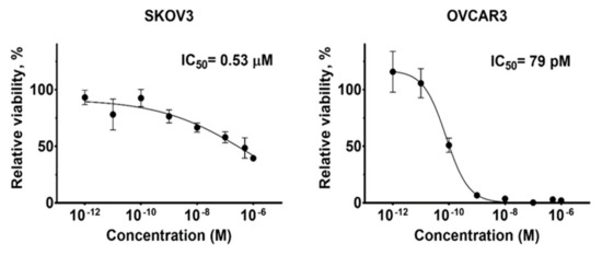 Ec1-LoPE showed EpCAM-mediated binding and a strong affinity with a subnanomolar KD value to SKOV3 and OVCAR3 cells (Figure 4A, Table 1). A high internalization rate of Ec1-LoPE (Figure 3) suggested efficient intracellular delivery of LoPE and its inhibition of growth of EpCAM-overexpressing SKOV3 and OVCAR3 cells (Figure 5) demonstrated a potent cytotoxic effect in vitro. The higher IC50 value in SKOV3 cells compared to OVCAR3 cells might be due to several factors, such as differences in EpCAM expression level [84] and differences in sensitivity to toxin treatment. It was previously observed for HER2-targeting affibody–drug and affibody–toxin conjugates that SKOV3 cells are more resistant to cytotoxic action despite high expression of HER2 receptors [82,85,86]. The results of the in vivo specificity experiment demonstrated EpCAM-mediated accumulation of Ec1-LoPE in human xenografts in mice (Figure 6).