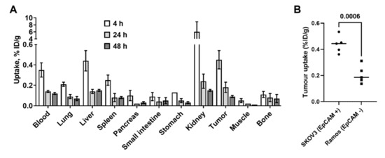 To determine the biodistribution of Ec1-LoPE over time, female BALB/c nu/nu mice bearing SKOV3 xenografts were injected with [125I]I-PIB-Ec1-LoPE. The animals were euthanized at 4, 24, and 48 h pi, the organs and tissues were excised, and their radioactivity was measured (Figure 6A). Biodistribution was characterized by a low level of activity retention in the majority of normal organs (below 1%ID/g at 4 h) except kidneys. Fast clearance from blood was observed, as the radioactivity in blood was less than 0.5% ID/g after 4 h. The activity in normal organs and tumors decreased further by 24 h. Biodistribution of [125I]I-PIB-Ec1-LoPE in BALB/c nu/nu mice bearing EpCAM-positive SKOV3 xenografts and EpCAM-negative Ramos xenografts was compared at 4 h pi (Figure 6B). No significant differences in uptake in normal organs or tissues (except bone, p = 0.018, t-test) were observed; however, a significantly (p < 0.005, t-test) lower uptake was observed in HER2-negative Ramos xenografts compared to HER2-positive SKOV3 xenografts.
