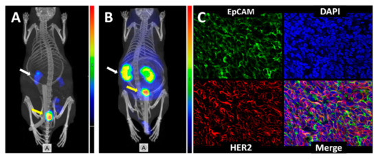 Micro-single photon emission computed tomography (SPECT)/CT imaging of (A) EpCAM expression using [125I]I-PIB-Ec1 at 6 h pi; (B) HER2 expression using [99mTc]Tc-ZHER2:V2 at 4 h pi in BALB/c nu/nu mice bearing SKOV3 xenografts. White arrows point at kidneys, yellow arrows point at tumors. Co-expression of HER2 and EpCAM in SKOV-3 xenografts (C). EpCAM is stained green, HER2 is stained red, nuclei were counterstained with DAPI (blue) (200× Magnification).