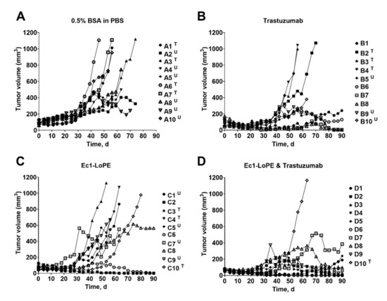 Tumor volume growth curves for individual mice from four groups receiving: subcutaneous (s.c.) injection of vehicle (0.5% BSA in PBS) for six consecutive weeks (A), s.c. injection of trastuzumab (B), intravenous (i.v.) injection of Ec1-LoPE (C), and s.c. injection of trastuzumab together with i.v. injection of Ec1-LoPE (D). The doses and frequency of trastuzumab injections were 8 mg/kg for the first two weeks and 4 mg/kg for the next four consecutive weeks. The injections of Ec1-LoPE (1 mg/kg) were carried out at days 0, 2, 4, 7, 35, 37, 39, 42. Mice were euthanized when xenograft volume exceeded 1000 mm3 (T) or bleeding ulcers were observed (U). Four groups of mice (10 animals per group) were used in the experiment.
