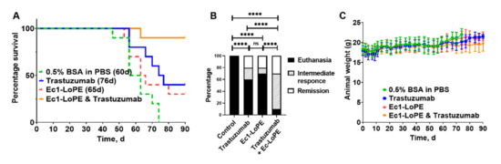 The median survival time in the treatment groups with single therapy was longer than in the vehicle control group (60 days for control, 65 days for Ec1-LoPE, and 76 days for trastuzumab). In the combination treatment group, only one mouse was euthanized within the permitted follow-up time of 90 days, resulting in significantly prolonged survival in the co-treatment group compared to the single treatment groups (Mantel–Cox log-rank test, p = 0.0083 compared to Ec1-LoPE monotherapy and p = 0.026 compared to trastuzumab monotherapy) and the control group (Mantel–Cox log-rank test, p = 0.0001). Therapy outcome was significantly better for the combination therapy than for monotherapies according to chi-square test (Figure 9B).