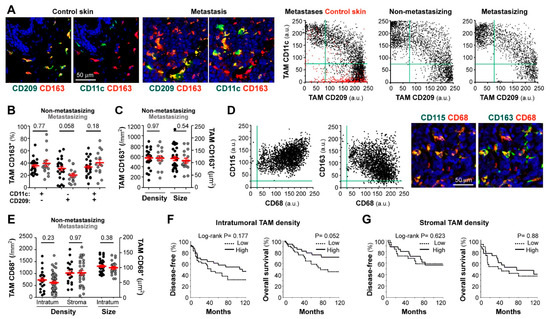 Correlation between patient evolution and TAM density, size, and polarization state. Confocal microscopy screening of two independent and differently preserved primary melanoma collections: frozen (stage I-III; (A–C)) and FFPE (stage II-IV; D–G). (A) Frozen tissues co-stained for CD163 (red) and CD11c or CD209 (green), as indicated. Dot-plots show single-cell MFI (arbitrary units, a.u.) for CD11c and CD209 proteins simultaneously quantified at CD163+ TAMs in control skin (n = 3, red dots), skin metastases (n = 6), non-metastasizing (n = 24) and metastasizing (n = 11) primary melanomas. (B) Relative percentages of polarized TAMs through the whole cryopreserved primary collection (n = 40). (C) Average density (by mm2) and size (µm2) of CD163+ TAMs quantified through intratumoral and/or peritumoral regions of primary melanomas (n = 40). (D) Paraffin-embedded melanoma co-stained for pan-macrophage markers CD68 (red) and CD163 or CD115 (green), as indicated. Dot-plots show single-cell expression of CD68 vs. CD115 or CD163 proteins quantified in either CD68+, CD163+ and/or CD115+ TAMs (n = 3 non-metastasizing and 3 metastasizing primary melanomas). (E) CD68+ TAM density quantified through intratumoral (n = 83) and stromal (n = 54) areas of primary melanomas. TAM size at intratumoral regions (n = 83), are shown. (F,G) Correlation between patient evolution and CD68+ TAM density at intratumoral (F) and stromal (G) regions. Disease-free and overall survival 10-year Kaplan–Meier curves are shown. Cut-off values were calculated from ROC curves to classify as ‘low’ or ‘high’ density. P values are shown (Log-rank). Mann-Whitney statistical analysis was used to compare non-metastasizing vs. metastasizing melanomas in (B,C,E) panels. Scale bars, 50 µm.