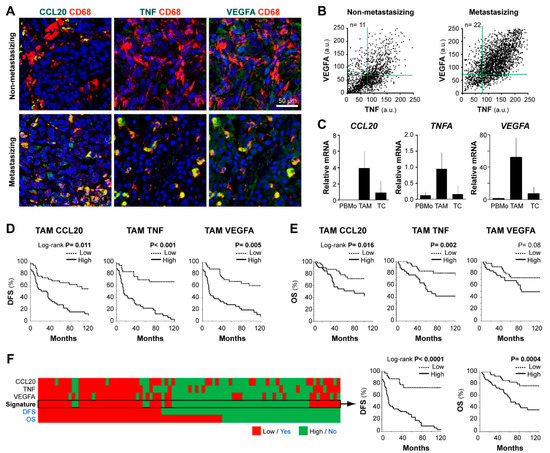 We previously identified co-expression of CCL20, TNF, and VEGFA cytokines by tissue TAMs in an exploratory set of 7 metastasizing melanomas [17]. Now, we tested the hypothesis that this distinctive prometastatic TAM secretory phenotype can be identified in routine FFPE samples, to be clinically applicable for patient profiling. First, we established conditions to quantify by multicolor fluorescent-microscopy the content of CCL20, TNF, and VEGFA in CD68+ cells in FFPE melanoma tissues. To validate the staining specificity, we preincubated the anti-cytokine antibodies with an excess of each cytokine, confirming that staining was specifically blocked on FFPE melanoma tissues (Supplementary Figure S1). Figure 2A shows representative images of CD68+ TAMs merged with CCL20, TNF, or VEGFA of two primary melanoma samples representative of low and high cytokine expression profiles. Dot plots in Figure 2B represent quantification at the single-cell level of VEGFA and TNF MFI in accumulated TAMs from n = 11 non-metastasizing melanomas compared with n = 22 metastasizing primary melanomas, showing higher TNF/VEGFA expression by CD68+ TAMs in clinically aggressive melanomas. Correlations between TNF and VEGFA MFI levels (R = 0.69, n = 22, p < 0.001) or TNF and CCL20 (R = 0.62, n = 10, p < 0.001) by TAMs were found among cases of metastasizing tumors, indicating a positive relationship among these protumoral cytokines. To assess the cytokine expression profile of primary tissue cells with a different methodology, we purified TAMs and tumor cells from 4 thick metastasizing primaries (stage IV patients at diagnosis) to quantify mRNA expression, showing active gene expression of TNF, CCL20, and VEGFA by TAMs compared to peripheral blood monocytes isolated from these patients. In contrast, remaining cancer cells transcribed less CCL20, TNFA, and VEGFA than TAMs (Figure 2C). Next, we used the Kaplan–Meier method to assess the clinical relevance of quantifying the MFI expression level of CCL20, TNF, and VEGFA cytokines by TAMs in FFPE melanoma tissues from 83 primary melanoma patients (Figure 2D,E). Patients were stratified as ‘high’ or ‘low’, using the cell-specific median MFI value for each cytokine as the cut-off point. High TAM-CCL20 or TAM-TNF content correlated with shorter DFS and OS (log-rank test, p ≤ 0.01), whereas high TAM-VEGFA expression correlated only with shorter DFS (p = 0.005). CCL20 and TNF were not expressed by cancer cells and no correlation was found between cancer cell-VEGFA content and DFS or OS (p = 0.19and p =0.63, respectively) (Table 1 and Table S2). To determine whether TAM-specific quantification of CCL20, TNF, or VEGFA were independent prognostic factors, we performed a multivariate regression analysis including gender, age, location, histologic type, ulceration, Breslow, and stage parameters (Table 1). This analysis showed that TAM-specific CCL20 and TNF expression levels were independent prognostic factors for DFS (p < 0.001) and OS (p = 0.004 and p = 0.001, respectively) in this cohort. Whereas TAM-VEGFA content was an independent predictor of DFS (p < 0.001) but did not reach significance for OS. Finally, we analyzed the prognostic value of the CCL20/TNF/VEGFA combined secretory TAM phenotype, showing its great potential in the prediction of DFS and OS of primary melanoma patients (p < 0.0001 and p = 0.0004, respectively) (Figure 2F). Consequently, we validated our previous pilot study in a large and independent patient cohort, using standard FFPE tissue sections instead of cryosections, and confirmed the role of CCL20, TNF, and VEGFA expression by TAMs in predicting clinical behavior of primary cutaneous melanoma patients. Our results highlight the role of TAMs in biologically aggressive primary melanomas, suggesting that prometastatic TAMs are characterized by higher secretion of CCL20/TNF/VEGFA cytokines.