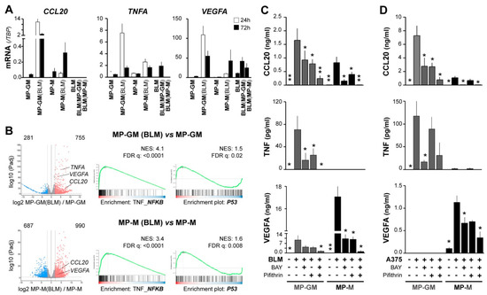NF-κB and p53 signaling pathways synergically contribute to CCL20, TNF, and VEGFA upregulation in macrophages conditioned by melanoma cells. (A) Macrophages differentiated with GM-CSF or M-CSF (MP-GM and MP-M, respectively) were cocultured with BLM cells for 24 h or 72 h, as specified, and then separated with anti-CD14-coated beads. Mutually conditioned cells were measured for CCL20, TNF, and VEGFA mRNA expression relative to TBP (n = 3–5 donors). (B) Volcano plots showing DEG scores for 24h BLM-conditioned macrophages vs. unconditioned macrophages, as well as GSEA analyses showing normalized enrichment scores and false discovery rates (n = 3). (C,D) Conditioned media assessed for CCL20, TNF, and VEGFA protein secretion. As in A, differentiated macrophages were cocultured with BLM (C) or A375 (D) melanoma cells for 72 h in the absence or presence of 10 µM BAY11-7082 (NF-κB inhibitor) and/or 50 µM Pifithrin-α (p53 inhibitor), as indicated (n = 5–10). Asterisks denote statistically significant differences relative to melanoma/macrophage condition cocultured without inhibitors (paired t-test; * p < 0.05; ** p < 0.01).
