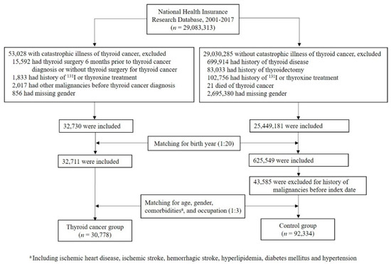 The flowchart depicting the identification of subjects in the thyroid cancer group and the control group is shown in Figure 1. A total of 29,083,313 individuals were identified, including 53,028 subjects with catastrophic illness cards of thyroid cancer and 29,030,285 subjects without this card in the NHIRD dataset between 2001 and 2017. Individuals were excluded if they met the exclusion criteria as described above. After initial matching for birth year (1:20), followed by secondary matching for age, gender, histories of ischemic heart disease, ischemic stroke, hemorrhagic stroke, hyperlipidemia, diabetes mellitus, hypertension, and occupation (1:3), there were 30,778 and 92,334 individuals in the thyroid cancer group and the control group, respectively.