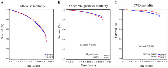 Kaplan–Meier survival curves for thyroid cancer patients and controls. (A) all-cause, (B) other malignancies, and (C) cardiovascular disease mortality in the thyroid cancer group compared with the control group.