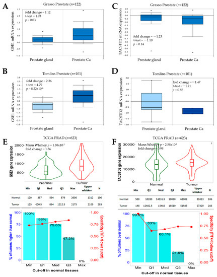 Our bioinformatics-aided probe of the Gene Expression Omnibus (GEO)-derived GSE35988 dataset of lethal castration-resistant PCa (CRPC) (Grasso Prostate, n = 122) showed that, compared to normal prostate gland samples, samples from patients with PCa exhibited a higher expression of GSE1 mRNA (fold change = 1.12, p = 0.03) (Figure 1A). Similarly, from a reanalysis of the GSE6099 microarray gene expression profiling of the PCa progression dataset (Tomlins Prostate, n = 101), we observed that PCa cases had a 2.36-fold increase (p = 8.22 × 10−6) in GSE1 transcript expression, relative to that in normal prostate glands (Figure 1B). On the other hand, we found that TACSTD2 expression was downregulated 1.23-fold (p = 0.14) and 1.47-fold (p = 0.87) in the PCa group, compared to that in their normal prostate gland counterparts from the Grasso Prostate and Tomlins Prostate cohorts, respectively (Figure 1C,D). This was further corroborated by results from the analysis of the National Cancer Institute Genomic Data Commons (NCI GDC) TCGA PRAD cohort (n = 623), which showed that, while the GSE1 gene was significantly upregulated (1.36-fold, p = 1.88 × 10−7), the TACSTD2 gene expression was downregulated (0.98-fold, p = 2.58 × 10−1) in PCa, compared with the normal samples (Figure 1E,F). These data indicate, at least in part, that an increased GSE1/TACSTD2 expression ratio defines patients with PCa.