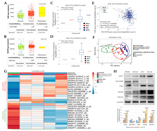 Having demonstrated an inverse correlation between GSE1 and TACSTD2, we further probed its biomolecular and clinical implications. Using the TCGA PRAD cohort (n = 623), we found that, compared with the non-tumor ‘normal’ and primary PCa cases, patients with metastatic PCa exhibited a significantly higher expression of GSE1 (normal < tumor < metastatic, p = 1.11 × 10−6) (metastatic vs. normal: 2.01-fold, p = 3.91 × 10−1; metastatic vs. tumor: 1.36-fold, p = 4.64 × 10−2) (Figure 2A). Conversely, TACSTD2 gene expression was the lowest in the metastatic samples, compared with the normal or tumor samples (metastatic vs. normal: 1.39-fold, p = 5.77 × 10−2; metastatic vs. tumor: 0.72-fold, p = 1.09 × 10−1) (Figure 2B). Because of the interplay between disease aggression, progression, and prognosis, we reanalyzed the TCGA PRAD cohort (n = 623) for a potential correlation between the differential expression of GSE1 and TACSTD2 and the metastasis (M) stage. We observed that, compared with its expression in patients with negative metastasis status (M0), high GSE1 expression was mostly associated with metastasis to the bones (M1b) in patients with PCa (f = 0.70, p = 0.55) but less so with metastasis to distant lymph nodes (M1a) and distant organs (M1c) (Figure 2C). Interestingly, we also found that, relative to the M0 cases, the expression of the TACSTD2 gene was significantly downregulated in patients with metastasis to the bones (M1b) and to distant lymph nodes (M1a) (f = 1.23, p = 0.30) (Figure 2D). Moreover, we showed that the levels of GSE1 and TACSTD2 expression were inversely correlated (Pearson’s rho = −0.18, p = 0.00004) and that GSE1highTACSTD2low was associated with a higher incidence of biochemical recurrence (BCR) (Figure 2E). The principal component analysis (PCA) of the GSE32265 expression data, for primary localized PCa vs. castration-resistant bone metastatic prostate (Homo sapiens, A-AFFY-33, AFFY_HG_U133A; n = 55 samples; 22 283 genes), showed that GSE1lowTACSTD2high mostly explained ‘normal’ non-PCa cases, whereas GSE1highTACSTD2low largely characterized castration-resistant bone metastatic prostate cancer, especially after androgen deprivation and ADT-naive localized PCa (Figure 2F). Our expression-based heatmap, generated from the analysis of the same GSE32265 cohort (n = 55), showed that the high expression of GSE1 correlated with the upregulated expression of the angiogenesis biomarkers (vascular endothelial growth factor A (VEGFA) and angiopoietin 2 (ANGPT2)), a biomarker of T-cell non-inflamed or cold tumors (β-catenin (CTNNB1)), metastasis biomarkers (slug (SNAI2) and vimentin (VIM)), and a marker of proliferation (MKI67/Ki-67), with concomitantly suppressed TACSTD2 expression in castration-resistant bone metastatic prostate cancer, regardless of the presence of the transmembrane serine protease (TMPRSS)2-erythroblast transformation-specific transcription factor ERG variant 10 (ERG) fusion gene (Figure 2G). Interestingly, we also found the co-upregulation of GSE1, ANGPT2, VEGFA, KLK3 (kallikrein-3, prostate-specific antigen), CTNNB1, and TACSTD2 in localized PCa in the presence of the TMPRSS2-ERG fusion gene (Figure 2G). In parallel Western blot assays, we also demonstrated that, compared to HPrEC (normal human prostate epithelial cells), GSE1 protein expression was concomitantly upregulated with VIM, SNAI2, and VEGFA in the LNCaP (androgen-sensitive metastatic PSApositive), PC3 (bone metastatic grade IV androgen-independent), and DU145 (moderately metastatic androgen-independent PSAnegative) cells, while TACSTD2 expression was downregulated (Figure 2H). These data show that the interaction between GSE1 and TACSTD2 plays a critical role in metastatic disease, castration resistance, and disease progression in patients with PCa.