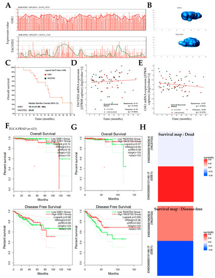 Having shown that the interaction between GSE1 and TACSTD2 plays a critical role in metastatic disease, castration resistance, and disease progression in patients with PCa, we probed the GSE16560/GPL5474 PCa disease progression dataset (n = 281); consistent with previous data, we observed an interesting expression pattern wherein the GSE1 expression ‘peak’ corresponded to a TACSTD2 expression ‘dip’ (Figure 3A). Similarly, our three-dimensional visualization of the gene expression data points (individual samples) in the same GSE16560/GPL5474 PCa cohort (n = 281) showed that the TACSTD2 ‘knuckle/bulge’ finely fits into the GSE1 ‘hollow/gorge’, further corroborating an inverse GSE1/TACSTD2 correlation (Figure 3B). To further investigate the clinical relevance of this GSE1/TACSTD2 expression profile, we reanalyzed a pooled PCa dataset (n = 2205 samples) consisting of prostate cancer (DKFZ, Cancer Cell (2018)), prostate adenocarcinoma (MSKCC/DFCI, Nature Genetics (2018)), metastatic castration-sensitive prostate cancer (MSK, Clin Cancer Res (2020)), and metastatic prostate adenocarcinoma (SU2C/PCF Dream Team, PNAS (2019)) from the cBioPortal platform (https://www.cbioportal.org/, accessed on 13 December 2020). The results showed that patients with high GSE1 expression exhibited markedly worse overall survival (OS) than their counterparts with high TACSTD2 expression (Figure 3C). We also observed that, while TACSTD2 mRNA expression was positively correlated with the overall survival time (Spearman rho = 0.12, p = 0.31) (Figure 3D), GSE1 expression was inversely correlated (Spearman rho = −0.07, p = 0.55) in the pooled PCa data (Figure 3E). In parallel analyses, using the TCGA PRAD cohort (n = 623), we showed that patients with high GSE1 exhibited worse OS (hazard ratio, HR = 3.3; Logrank p = 0.14) and worse disease-free survival (DFS: HR = 0.87; Logrank p = 0.66), compared to the low GSE1 group (Figure 3F). Conversely, high TACSTD2 expression conferred better OS (HR = 0.62, p = 0.57) and DFS (HR = 0.56, p = 0.04) (Figure 3G). Consistent with this, the survival map, generated from the analysis of the TCGA PRAD data, showed a strong association between the GSE1highTACSTD2low profile and disease-specific death, while the DFS was strongly associated with the GSE1lowTACSTD2high profile (Figure 3H). These data indicate that the inversely correlated GSE1 and TACSTD2 expression patterns determine the survival of patients with prostate cancer.