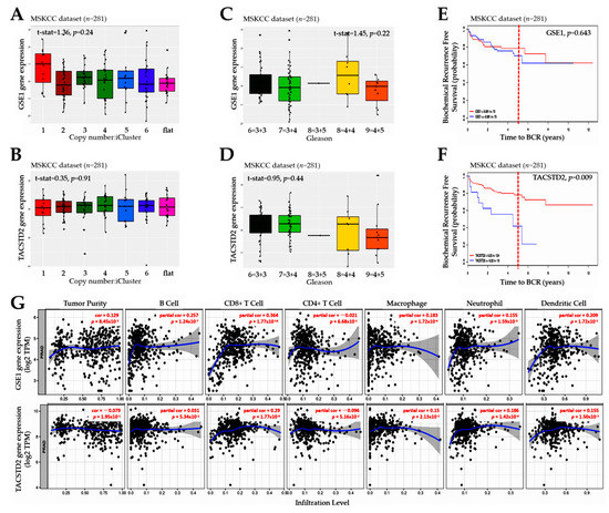 Consistent with contemporary knowledge that molecular interactions induced or facilitated by proline-rich motifs characterize many aspects of the immune response, and that these proline-rich factors mediate cell–cell communication, signal transduction, and antigen recognition [31], we also demonstrated that the GSE1 and TACSTD2 signal interplay affects the clinical and immune status and is indicative of the therapy responses and clinical outcomes in patients with PCa (Figure 4 and Figure 5). It is clinically relevant that GSE1 expression was higher in iClusters 1, 3, and 5 than in iClusters 2 and 6, while conversely, TACSTD2 expression was lower in iClusters 1 and 5 than in iClusters 2, 3, 4, and 6. Corroborating this finding, a recent report indicates that, in terms of the time to the BCR endpoint, primary tumors in ‘minimally altered cluster 2 had an extremely favorable prognosis’, in contrast to the ‘extremely unfavorable prognosis for the highly altered cluster 5 tumors’ [15]. In addition, our finding is consistent with outcome reports from the Cambridge cohort, wherein iCluster 2 and iCluster 1 clearly distinguished patient groups with better and worse prognoses, respectively, based on BCR survival data collected over 60 months [16]. In fact, the same study reported that ‘iClusters1 and 3 identified men with the highest risk of relapse more effectively than either elevated Gleason score (≥4 + 3), high PSA, extracapsular extension (ECE) or positive surgical margin (PSM), especially as about 6-in-10 of the iCluster1, and 8-in-10 of the iCluster3 patients progressed to recurrent disease’ [16]. It is, thus, conceivable that an elevated GSE1/TACSTD2 ratio better stratifies patients into good and poor outcome groups than PSA, ECE, and PSM. This study is currently ongoing.