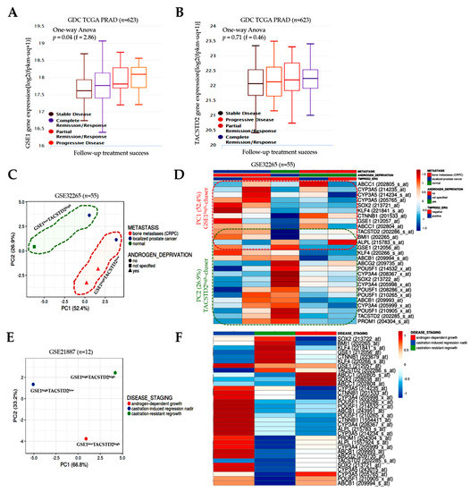GSE1 and TACSTD2 expression profiles are indicative of therapy responses and clinical outcomes in patients with prostate cancer. Box-and-whisker plots showing how (A) GSE1 or (B) TACSTD2 expression affects follow-up treatment success in the TCGA PRAD cohort. (C) Principal component analysis of the expression data for primary localized PCa vs. castration-resistant bone metastatic prostate in the GSE32265 cohort. Columns with similar annotations were collapsed by taking the mean in each group. Unit-variance scaling was applied to rows; SVD with imputation was used to calculate principal components. X- and Y-axes show Principal Components 1 and 2, which explain 52.4 and 26.9% of the total variance, respectively. N = 5 data points. (D) Expression heatmap showing the association between metastasis, androgen deprivation, TMPRSS2-ERG fusion gene, and expression of GSE1, TACSTD2, biomarkers of drug metabolism/resistance, and cancer stemness in the GSE32265 cohort. (E) Principal component analysis of the expression data for the treatment of castration-resistant prostate cancer in the GSE21887 cohort. X- and Y-axes show Principal Components 1 and 2, which explain 66.8 and 33.2% of the total variance, respectively. (F) Expression heatmap showing the association between disease stage and expression of GSE1, TACSTD2, biomarkers of drug metabolism/resistance, and cancer stemness in the GSE21887 cohort.