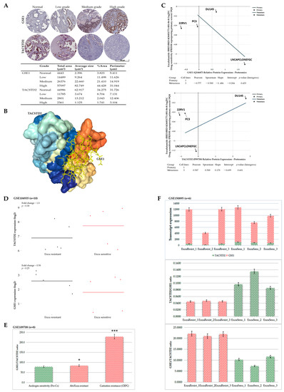 GSE1 and TACSTD2 interaction or expression profiles reflect abiraterone/enzalutamide drug resistance, androgen sensitivity, and castration resistance in patients with prostate cancer. (A) Representative IHC staining photomicrographs (top) and quantitative chart (bottom) of the differential expression of GSE1 or TACSTD2 protein in normal, low-grade, medium-grade, and high-grade PCa samples from the TMU-SHH cohort. (B) Molecular docking showing the direct interaction between TACSTD2 and GSE1. (C) Graphical representations of the association between GSE1 (top) or TACSTD2 (bottom) protein expression and enzalutamide sensitivity in 22RV1, DU145, PC3, and LNCaP clone FGC cell lines. (D) Line and dot plots of the differential expression of TACSTD2 (top) and GSE1 (bottom) in enzalutamide-resistant and enzalutamide-sensitive samples from the GSE104935 cohort. (E) Histograms showing the association between GSE1/TACSTD2 ratio and pre-castration androgen sensitivity, abiraterone/enzalutamide resistance, or castration resistance in the GSE109708 cohort. (F) Histograms showing GSE1 and TACSTD2 transcript expression (top), TACSTD2/GSE1 ratio (middle), and GSE1/TACSTD2 ratio (bottom) in enzalutamide-resistant or sensitive samples from the GSE150895 cohort. * p < 0.05; *** p < 0.001.