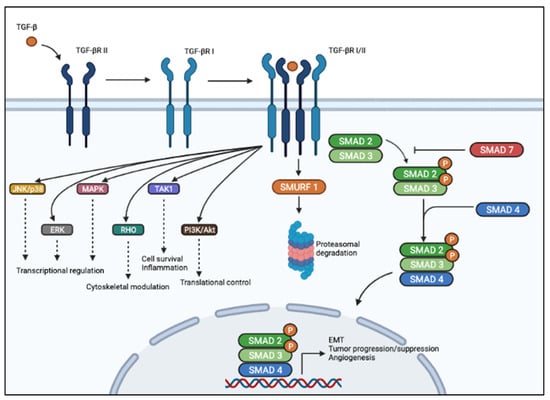 Besides the canonical SMAD-dependent signaling, activation of TGF-β receptors also results in the induction of several SMAD-independent pathways, including the mitogen-activated protein kinases (MAPK), c-Jun N-terminal Kinase (JNK)/p38 MAPK, Extracellular Signal-Regulated Kinases (ERKs), phosphatidylinositol-3 kinase (PI3K)/Akt, Rhodopsin (Rho) family GTPases involved in actin cytoskeletal changes and tight-junction resolution, and TGF-β-activated kinase-1 (TAK1) that modulates cell survival and inflammatory responses [31,32,33]. These SMAD-independent pathways can directly impact the activity of R-SMADs. For instance, AKT regulates SMAD3 activity by sequestering it in the cytoplasm, independent of its kinase activity [34], while ERK can activate SMAD2/3 through phosphorylation [35]. The SMAD-independent transcriptional and translational responses may crosstalk with SMAD-mediated activities to suppress or promote tumor progression [36].