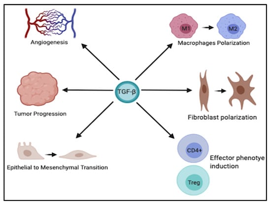Schematic representation of the multifaceted role of TGF-β. TGF-β is implicated in various physiological and pathological processes such as angiogenesis, tumor progression, EMT, and polarization of different immune and stromal cells. This figure was created with BioRender.com, accessed on 4 June 2021.
