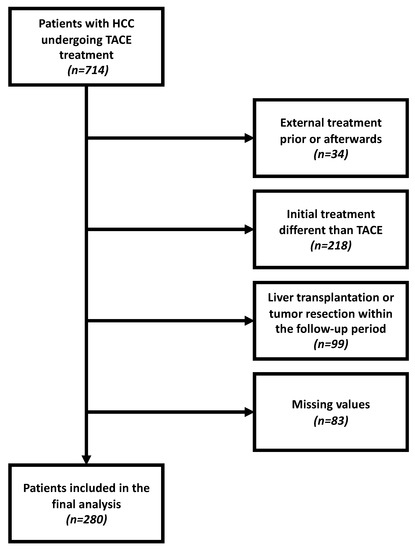 Between January 2010 and November 2020, a total of 714 patients with confirmed HCC were referred to our tertiary care center for TACE treatment. For the various reasons provided in Figure 1, 434 of these patients had to be excluded. Consequently, 280 treatment-naïve patients with complete laboratory and imaging data were included in the final analysis. Follow-up ended on 31 March 2021.