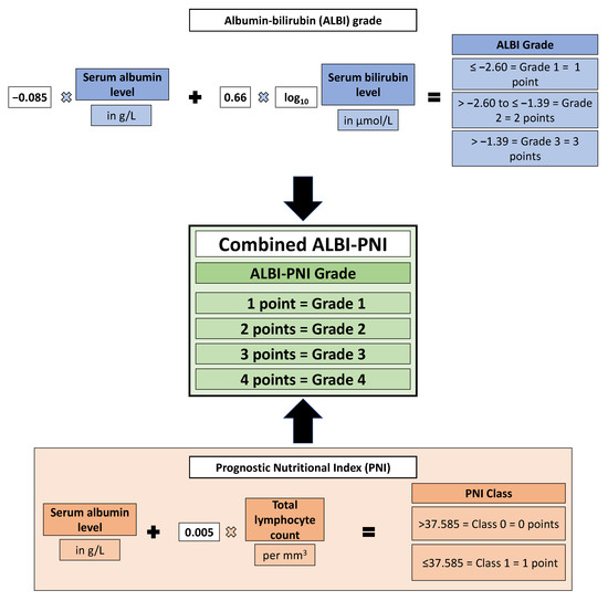 ALBI and PNI were calculated according to the original studies Figure 2 [25,33,34]. The PNI cut-off value was calculated using optimal stratification. The combined ALBI-PNI was calculated as follows: patients received a point value equal to their ALBI grade (1–3) and a value according to their PNI (high = 0 points; low = 1 point). These values were summed, resulting in an ALBI-PNI grade ranging from 1 to 4 points. The parameters included and their weighting factors are shown in Figure 2. BCLC, HAP, mHAP-II, and the Six-and-Twelve score were calculated as described in the original publications [3,8,16,17,18].