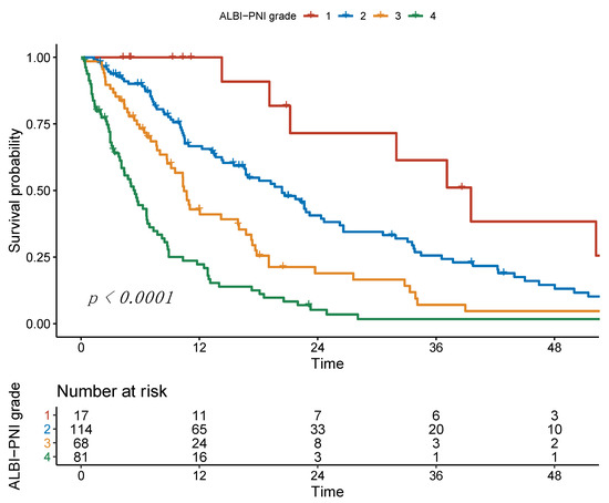 Kaplan–Meier curves of overall survival stratified according to the ALBI-PNI grade.