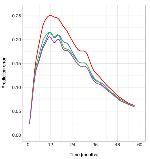 - Uno, H.; Cai, T.; Pencina, M.J.; D’Agostino, R.B.; Wei, L.-J. On the C-statistics for evaluating overall adequacy of risk prediction procedures with censored survival data. Stat. Med. 2011, 30, 1105–1117. [Google Scholar] [CrossRef] [PubMed] [Green Version]