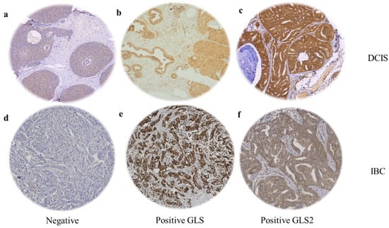 GLS and GLS2 protein expression in ER +/HER2- DCIS and invasive breast cancer. Representative TMA images (×20 magnification) depicting (a) negative immunostaining, positive GLS (b) and GLS2 (c) immunostaining in DCIS cases. (d) Negative immunostaining, positive GLS (e) and GLS2 (f) expression in invasive breast tumours.