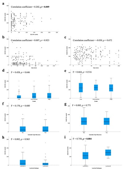 Glutaminase protein expression and its association with clinicopathological parameters and molecular subtypes in ER +/HER2- DCIS: (a) GLS and GLS2, GLS and (b) tumour size, (d) tumour grade, (f) comedo type necrosis, (h) luminal subtypes; GLS2 and (c) tumour size, (e) tumour grade, (g) comedo type necrosis, (i) luminal subtypes using Kruskal–Wallis test. Statistically significant p values are in bold.