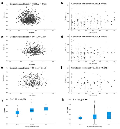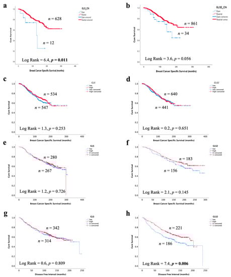In the METABRIC cohort, a total of 19/1398 IBC (1.4%) showed GLS CN gain, whereas 16 cases (1.1%) showed CN loss. Regarding GLS2, CN gain was observed in 50 cases (3.6%) and loss observed in only 7 cases (0.5%). There was an association between GLS and GLS2 CN variations and their corresponding mRNA expression (Figure 3g, p = 0.006 and Figure 3h, p = 0.032, respectively).