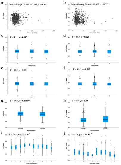 Glutaminase mRNA expression and its association with clinicopathological parameters: GLS and (a) tumour size, (c) tumour grade, (e) lymph node stage, (g) luminal subtypes, (i) METABRIC Integrative clusters; GLS2 and (b) tumour size, (d) tumour grade, (f) lymph node stage, (h) luminal subtypes, (j) METABRIC Integrative clusters were analysed using Pearson’s correlation coefficient. Data represented with median ± standard deviation. Statistically significant p values are in bold.
