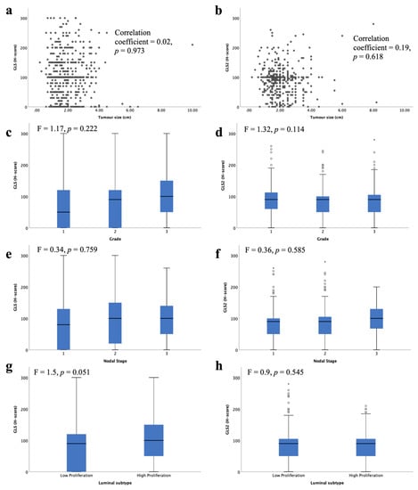High GLS and GLS2 mRNA were associated with lower tumour grade (Figure 4c, p = 0.017, Figure 4d, p = 0.026, respectively). There was no association between GLS or GLS2 mRNA expression with tumour size (Figure 4a,b) or nodal stage (Figure 4e,f).