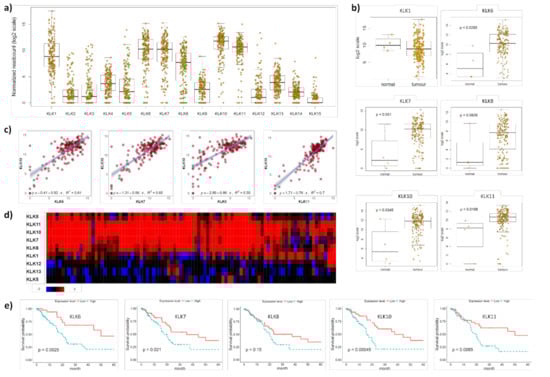 - Kryza, T.; Silva, M.L.; Loessner, D.; Heuzé-Vourc’h, N.; Clements, J.A. The kallikrein-related peptidase family: Dysregulation and functions during cancer progression. Biochimie 2016, 122, 283–299. [Google Scholar] [CrossRef]