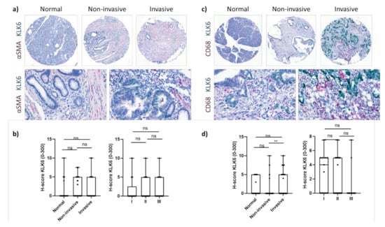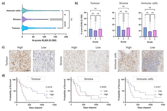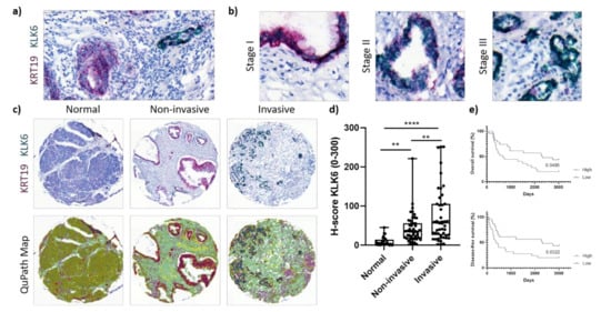 - Seiz, L.; Dorn, J.; Kotzsch, M.; Walch, A.; Grebenchtchikov, N.I.; Gkazepis, A.; Schmalfeldt, B.; Kiechle, M.; Bayani, J.; Diamandis, E.P.; et al. Stromal cell-associated expression of kallikrein-related peptidase 6 (KLK6) indicates poor prognosis of ovarian cancer patients. Biol. Chem. 2012, 393, 391–401. [Google Scholar] [CrossRef]