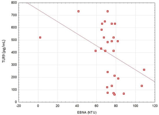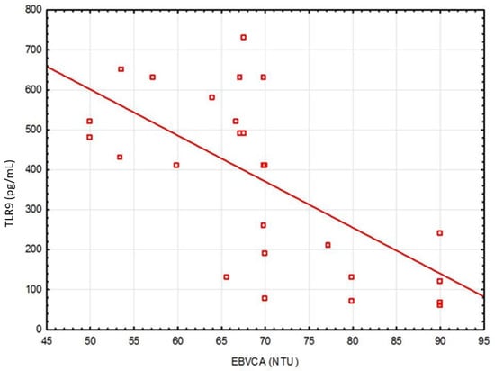 A correlation between TLR9 level and anti-EBVCA and anti-EBNA antibodies was stated (Figure 1 and Figure 2). An increase in the antibodies’ titer was accompanied by a decrease in TLR9 level.