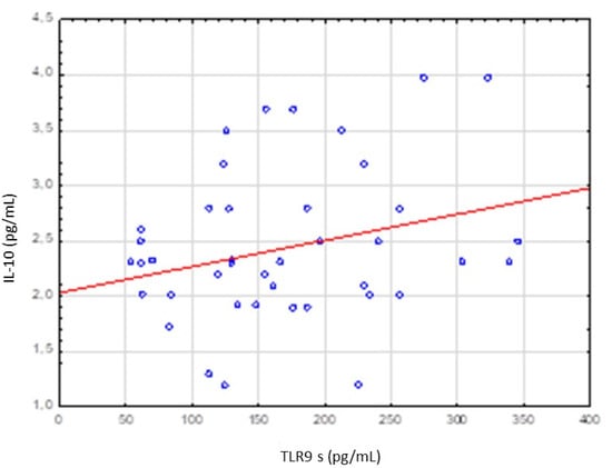 Correlation between serum levels of TLR9 and IL-10 level. Spearman rank test R = 0.226094 p = 0.149937.