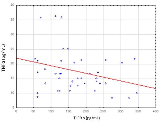 Correlation between serum level of TLR9 and TNFα level. Spearman rank test R = −0.235122; p = 0.133904.
