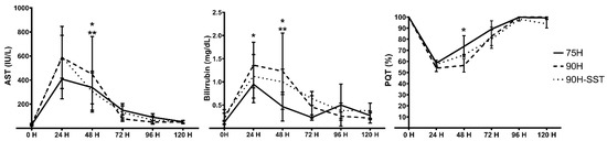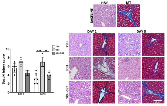 Liver injury related to sinusoidal congestion and hepatocellular vacuolization and necrosis was assessed according to the Suzuki score. While significant differences were not observed among the three groups after 24 h (75H 6 (4–7), 90H 7 (6–8), 90H + SST 5 (4–5), p = 0.06), histological injury was higher in 90H (7 (6–9)) relative to 75H (3 (2–5), p < 0.001) and 90H + SST (4 (3–5), p = 0.002) at 5 days (Figure 2).