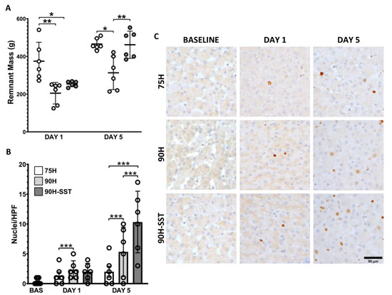 Twenty-four hours after surgery, remnant liver mass was higher in 75H (375 ± 112 g) compared with 90H and 90H + SST (205 ± 57 g and 254 ± 16 g, respectively, p < 0.01). In contrast, 5 days after surgery, remnant liver mass was higher in 75H and 90H + SST relative to 90H (469 ± 33 g and 463 ± 79 g versus 313 ± 107, respectively, p = 0.003) (Figure 3A).
