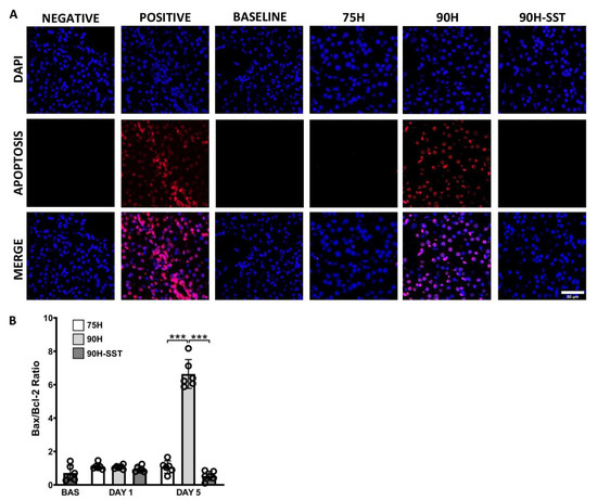 TUNEL immunofluorescence was used to evaluate apoptotic cells. After 5 days, a significantly greater number of TUNEL-staining cells were observed in the 90H group relative to 75H and 90H + SST (Figure 4A).