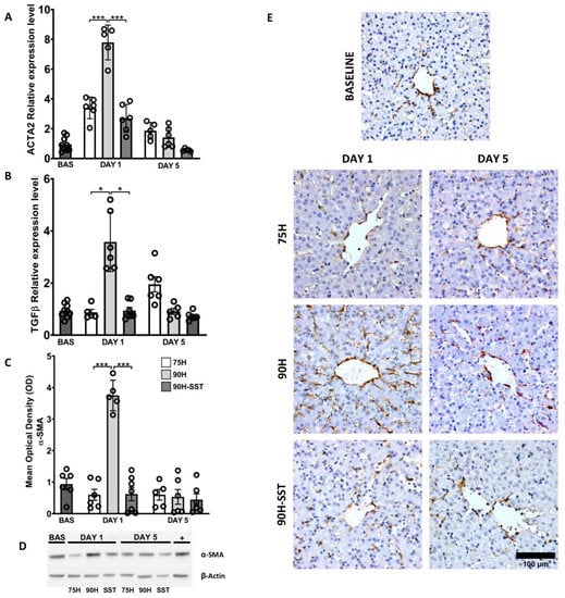 Changes related to hepatic stellate cell activation and transdifferentiation, determined by mRNA expression of ACTA2 (A) and TGF-β1 (B) and protein expression of α-SMA on Western blot (C,D) and immunostaining (E) following 75% hepatectomy (75H), 90% hepatectomy (90H), and 90% hepatectomy with continuous perioperative somatostatin infusion (90H + SST). * p < 0.05, *** p < 0.001.