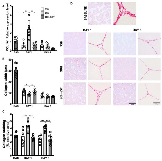Extracellular matrix remodeling was reflected in changes in the width of the ECM within hepatic lobules. After 24 h and 5 days, ECM width was considerably reduced relative to baseline in all three groups (p < 0.001). After 24 h, ECM width was significantly less in 90H (8.1 ± 1.3 μm) relative to 75H (10.7 ± 2.1 μm, p = 0.04) and 90H + SST (10.7 ± 1.7 μm, p = 0.01), though no differences were detected among the groups on the fifth day (Figure 6C).
