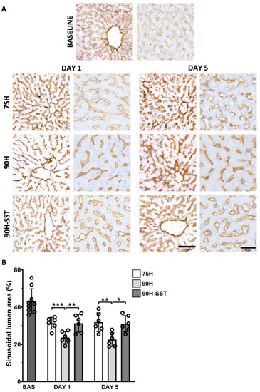 Liver sinusoidal endothelial cell injury and contraction was analyzed by calculating the sinusoidal lumen area (SLA) in CD31-immunostained samples. Twenty-four hours after surgery, sinusoidal contraction was observed in all three groups relative to baseline (p < 0.001). At 24 h, 90H had the lowest SLA (23.5 ± 3.6%) relative to 75H (31.1 ± 3.5%, p < 0.001) and 90H + SST (30.9 ± 4.3%, p = 0.008). This trend continued on the fifth postoperative day (90H 23.5 ± 3.6% versus 75H 30.9 ± 5.0%, p = 0.007, and 30.5 ± 4.3%, p = 0.02) (Figure 7).