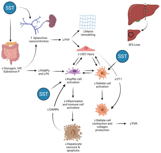 Potential sites of action and effects of somatostatin (SST) therapy in the “small-for-size” (SFS) liver. By binding its receptors in the endothelium and inhibiting secretion of gut-derived vasodilatory peptides, somatostatin (SST) induces vasoconstriction in mesenteric arteries and portomesenteric veins and reduces portal vein flow (PVF) in a dose-dependent manner. In the SFS liver, lower PVF results in decreased mechanical shear stress in the extracellular matrix and liver sinusoidal endothelial cells (LSECs) and reduced expression and translation of endothelin-1 (ET-1) mRNA by SECs. Both the indirect effects as well as the direct action of SST on hepatic stellate cells lead to decreased hepatic stellate cell activation and contraction, thereby preventing collagen deposition and helping maintain normal hepatic sinusoidal diameter, reducing portal vein resistance (PVR) and improving hepatic microcirculatory flow. At the same time, SST reduces intestinal permeability, leading to lower circulating levels of gut-derived pathogen-associated molecular patterns (PAMPs) and lipopolysaccharides (LPS). These multiple actions lead to decreased activation of Kupffer cells in the hepatic sinusoids, thereby stemming the production and secretion of different acute-phase molecules, such tumor necrosis factor alpha (TNF-α) and Fas ligand, which are inducers of hepatocellular necrosis as well as programmed cell death.
