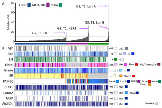 Clinical, morphological, and molecular characteristics of ILC cohorts analysed by gene panel and exome sequencing. (A) Individual ILC from three separate cohorts are ordered along the x-axis by increasing the mutation burden (y-axis, calculated according to the number of mutations detected per Mb of the genome sequenced). Tumour features (grade, size, and tumour phenotype) of those ILC with the highest mutation burden in each cohort are highlighted. (B) Clinical and pathological features of the tumours sequenced and mutations detected in common driver genes in ILC. Size: <2 cm = T1; 2–5 cm = T2; >5 cm = T3. Abbreviations: Alv = alveolar; Amp = amplified; Clas. = classic; ER = oestrogen receptor status; LN = lymph node; Mix. = mixed and other variants; Mut = mutated; TN-ILC = triple negative ILC; Sol. = solid; Trabec = trabecular; WT = wild type; G2 = grade 2; G3 = grade 3; LumA/LumB = Luminal A/B phenotype; and Claud. = claudin-low.