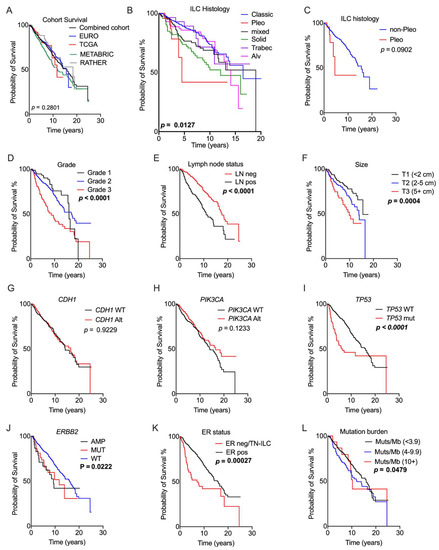 Association of genomic and pathology features with prognosis. Kaplan–Meier curves measuring survival associations of the following features: (A) overall survival; (B) ILC histology; (C) pleomorphic histotype; (D) grade; (E) lymph node status; (F) tumour size; (G) CDH1 gene status; (H) PIK3CA gene status; (I) TP53 gene status; (J) ERBB2 gene status; (K) ER status; and (L) tumour mutation burden expressed as mutations/Mb. The RATHER data were included for this analysis with the exception of (L). Abbreviations: Alt = any genetic alteration; Alv = alveolar; AMP = amplification; LN = lymph node; MUT = mutation; neg = negative; pleo = pleomorphic; pos = positive; TN-ILC = triple-negative ILC; trabec = trabecular; and WT = wild type. Significant p-values (log-rank test) are noted in bold.