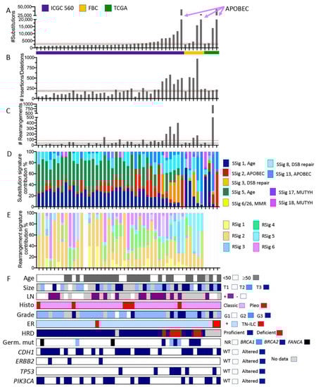Somatic mutation characteristics of ILC derived from whole genome sequencing data. Individual tumours from three cohort studies are organised in each plot on the x-axis according to increasing numbers of somatic substitution mutations (y-axis in A). Plots (B,C) show the numbers of small insertions/deletions and large rearrangements, respectively. ICGC 560 overall cohort medians for the numbers of substitutions, insertions/deletions, and rearrangements are depicted by the red dotted lines in (A–C); similarly, the medians for the ILC in this pooled cohort are depicted by the black dotted line. Plots (D,E) show how the proportion of substitutions (from A) and rearrangements (from C) were assigned to substitution mutational signatures (SSig) or rearrangement signatures (RSig), respectively. Note that rearrangement signatures for ILC from the TCGA cohort were not calculated. (F) Clinicopathological features and mutation of key cancer driver genes. Abbreviations: DSB repair = double strand break repair; FBC = familial breast cancer cohort; G1, G2, G3 = grade 1, 2, or 3, respectively; Germ. Mut = germline pathogenic mutation; HRD = Homologous recombination deficiency, as defined by HRDetect [28] (proficient = functional HR-based DNA repair; deficient = non-functional HR-based DNA repair); MMR = mismatch repair; LN = lymph node; NR = not recorded; Pleo = pleomorphic; RSig = rearrangement signature; SSig = substitution signature; T1, T2, T3 = tumour size; and WT = wild type. Colour coding is described in the associated legends for each plot.
