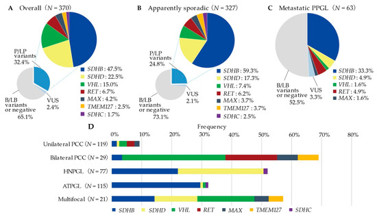 The genetic aetiology and genotype-phenotype relationship of PPGL have been studied extensively in Caucasian populations [5,6,11,17,18,19]. Recently, a large population study of 719 Chinese and 919 European patients demonstrated broad Sino-European differences in the genetic landscape and clinical presentation of PPGL [20]. This study suggested that the genetic background of PPGL and the associated genotype–phenotype relationship established in Caucasian populations may not apply to Asian populations. It is also worth noting that in the few cohort studies of PPGL in Asia [21,22,23], the profiles of the most common mutated gene and the recurring SDHB variants vary widely by ethnicity even within Asia. In several case reports and case series from Japan, characteristic variants with PPGL have been reported [24,25,26,27,28]; however, there are no comprehensive national studies. We aimed to investigate the prevalence of germline variants in the major susceptibility genes (MAX, SDHB, SDHC, SDHD, TMEM127, VHL, and RET) in the Japanese population with PPGL. Furthermore, we evaluated variant classification based on several updated databases and in silico meta-prediction tools and summarised the clinical and genetic features of patients with PPGLs in Japan.