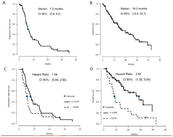 Median PFS (A) and OS (B) for the entire patient cohort. Clinical outcome stratified by response shows significantly better PFS (C) and OS (D) in patients who at least achieved a VGPR.