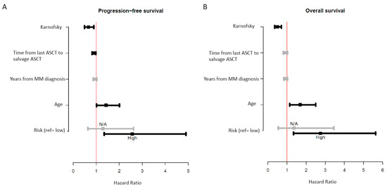 The response to salvage ASCT was evaluated within 100 days using IMWG criteria [22]. Imaging analysis using PET-CT or DW-MRI was performed as previously described to document the response of focal lesions [23]. MRD was assessed using eight-color flow cytometry as previously described [24]. In brief, BM samples were immunephenotyped on a FACSCanto II flow cytometer using an eight-color technique (CD138 (V-500), CD38 (FITC), CD19 (PE-Cy7), CD45 (V-450), CD27 (PercpCy5.5), CD81 (APC-H-7), CD56 (APC), and CD20 (PE)). MRD negativity was defined by the presence of fewer than 20 events indicating phenotypically aberrant clonal plasma cells after acquiring at least 2.0 × 106 total events. MRD sensitivity was one MM cell in 105 bone marrow cells. GEP70 risk stratification was analyzed on available samples at diagnosis as previously published using Affymetrix U133 2.0 plus arrays (Affymetrix, Santa Clara, CA, USA) on CD138-enriched PCs [25,26].