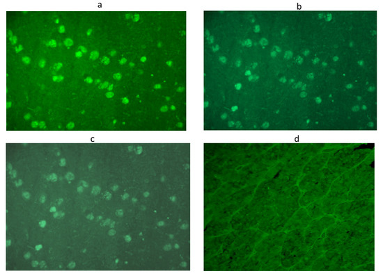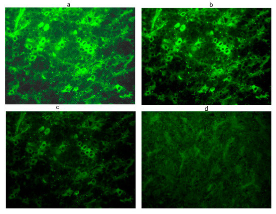 Anti-hypothalamus antibodies detected by immunofluorescence method in a serum positive at 1:32 titer: Intracytoplasmatic immunofluorescence of hypothalamic cells at different dilutions: 1:8 (a), 1:16 (b),1:32 (c),until the disappearance of significant immunofluorescence at adilution of 1:64 (d). Scale bar: 40×.