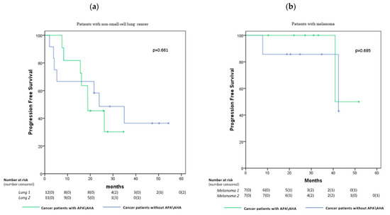 Kaplan–Meier curves comparing PFS in the patients with non-small-cell lung cancer (a) and melanoma (b) showing no significant differences in the groups with and without APA/AHA: 18.8 vs. 23.9 months, respectively, in patients with non-small-cell lung cancer (p = 0.661) and 40.9 vs. 42.4 months, respectively, in patients with melanoma (p = 0.695).
