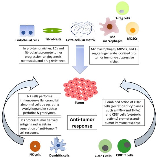 DCs (Dendric cells) play an important role in the initiation, development, and maintenance of the anti-tumor immune response. Dying cells release damage-associated molecular patterns (DAMPs), which are predominantly intracellular proteins and induce the production of cytokines and activation of T cells [113]. Upon uptake of antigens, DCs undergo maturation and migrate to lymph nodes, where they present the antigens to CD8+ T cells [114]. DCs are broadly divided into two classes, conventional type 1 DCs (cDC1s) and conventional type 2 DCs (cDC2s). cDC1s functions primarily by cross-presenting antigens to CD8+ T cells. In contrast, cDC2s function by priming CD4+ T cell response [115]. Furthermore, based on transcriptional and chromatin variations, cDC2s have been divided into anti-inflammatory cDC2A (T-bet+) and pro-inflammatory cDC2B (T-bet-) [116]. cDC1s are essential for mounting an anti-tumor immune response. cDC1s infiltration has been found to positively correlate with T cell infiltration and increased survival. Tumor evasi strategies include the prevention of cDC1 infiltration into the tumor microenvironment [87]. cDC1 binds to F-actin exposed necrotic bodies through C-type lectin receptor DNGR-1. This process leads to the uptake and cross-presentation of antigens from dead cell debris to initiate CD8+ T cell response [117]. Recently, tumor-secreted gelsolin (sGSN) has been found to dampen the immune response by impairing the DNGR-1-dependent cross-presentation in cDC1 [118]. The third class of DCs is known as plasmacytoid dendritic cells (pDC), with appearances like plasma cells and characteristic production of high levels of interferon-α [119]. Tumor-promoting features of aberrant pDCs with poor production of type-I IFN and T-reg differentiation were displayed in patients with breast and ovarian cancer [120,121]. The molecular basis of the differentiation of DCs in the tumor microenvironment is an active area of research and may hold promise in the development of future immunotherapies.